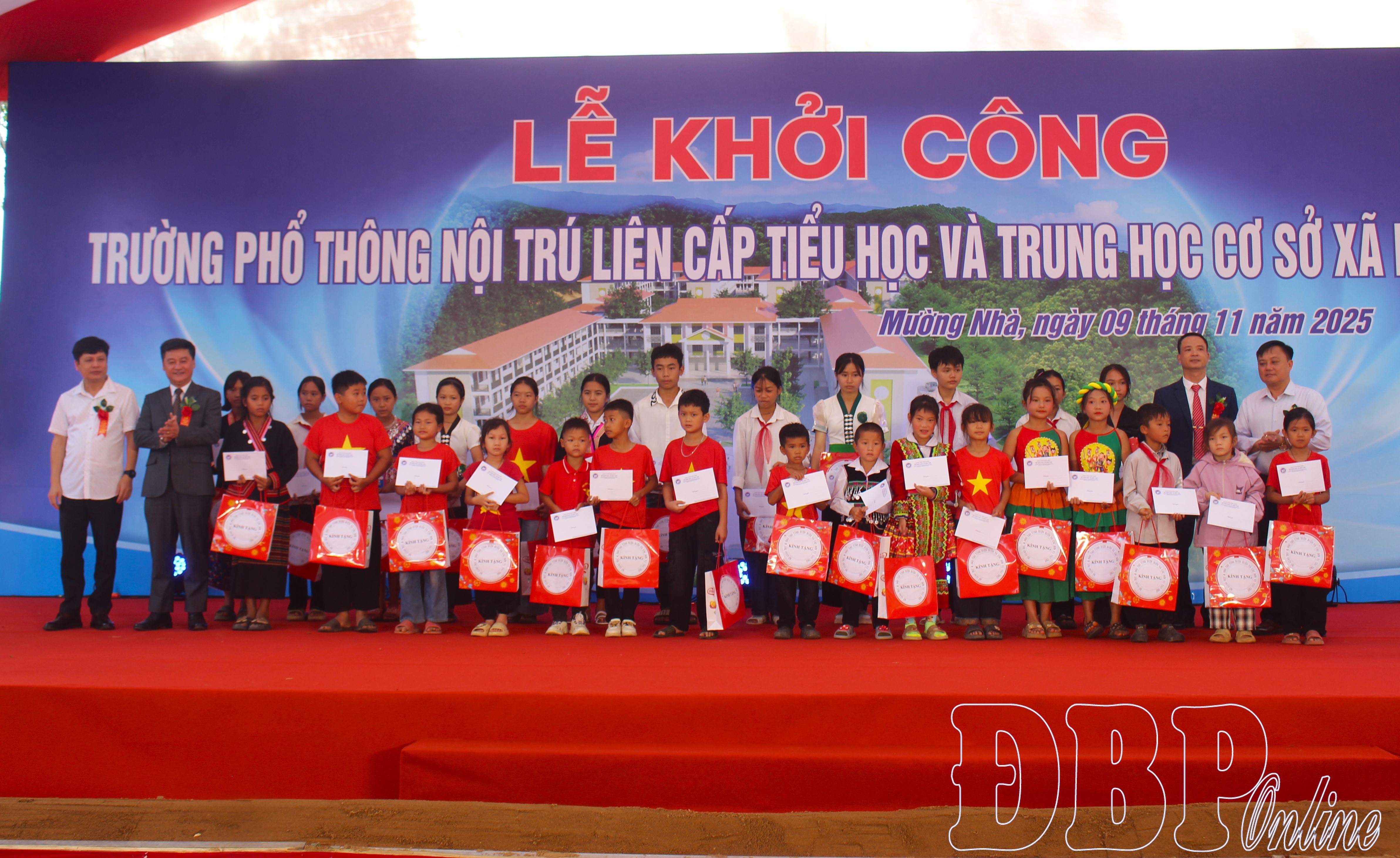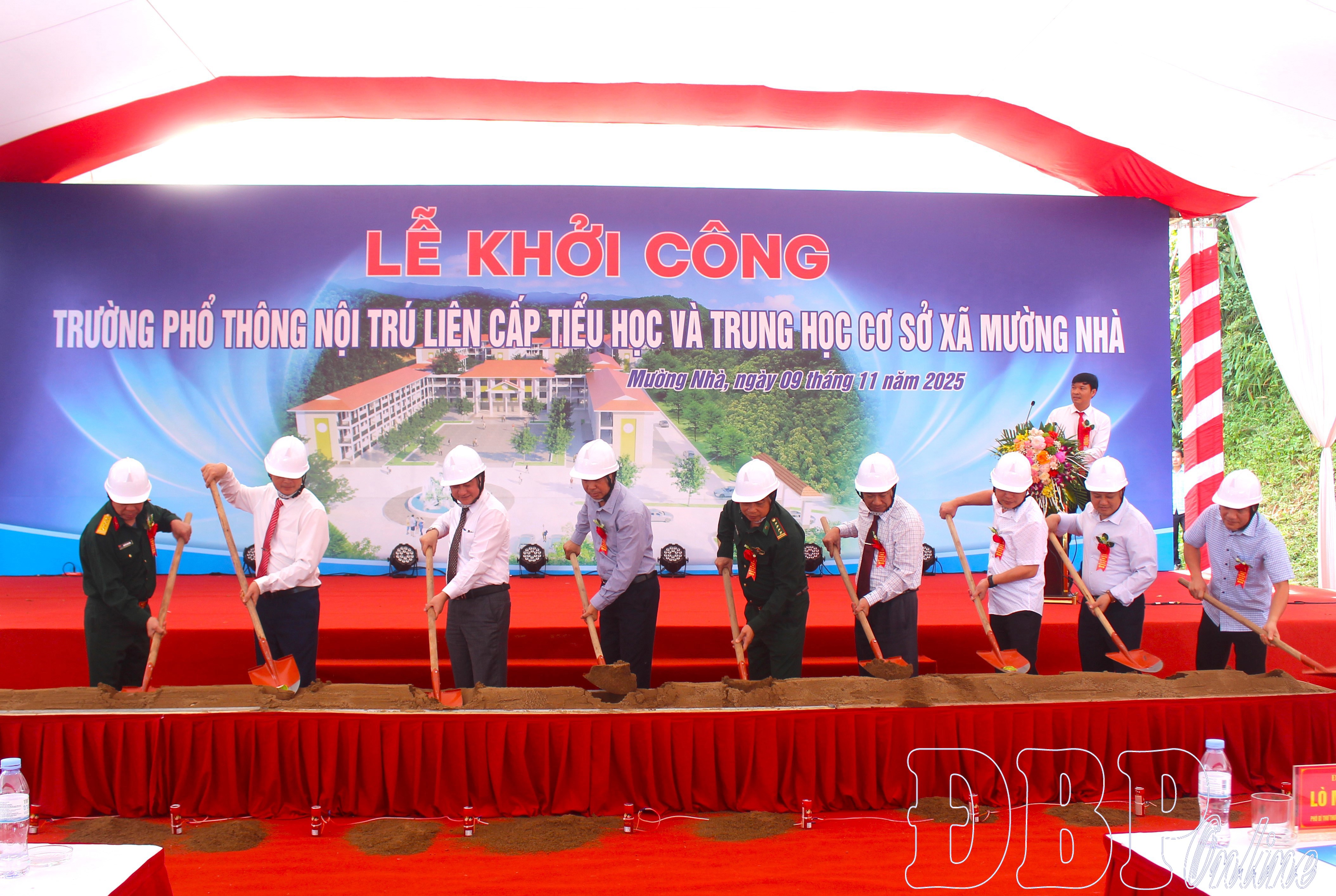 Trường Phổ thông nội trú liên cấp Tiểu học và Trung học cơ sở Mường Nhà có tổng mức đầu tư 200 tỷ đồng, trên diện tích gần 9,3ha. Trường được thiết kế hiện đại với 31 phòng học lý thuyết, 13 phòng học bộ môn, 99 phòng nội trú, khu nhà công vụ giáo viên, nhà đa năng, bể bơi và các hạng mục phụ trợ như sân thể thao, hệ thống điện, nước, chiếu sáng, phòng cháy chữa cháy… đáp ứng nhu cầu học tập và giảng dạy của hơn 1.080 học sinh cùng gần 80 cán bộ, giáo viên, nhân viên. Dự án dự kiến hoàn thành vào tháng 8/2026. Nhân dịp này, UBND xã Mường Nhà đã tặng Giấy khen cho 1 gia đình hiến đất, 2 cá nhân có thành tích trong công tác vận động nhân dân và tặng quà 30 học sinh có hoàn cảnh khó khăn.