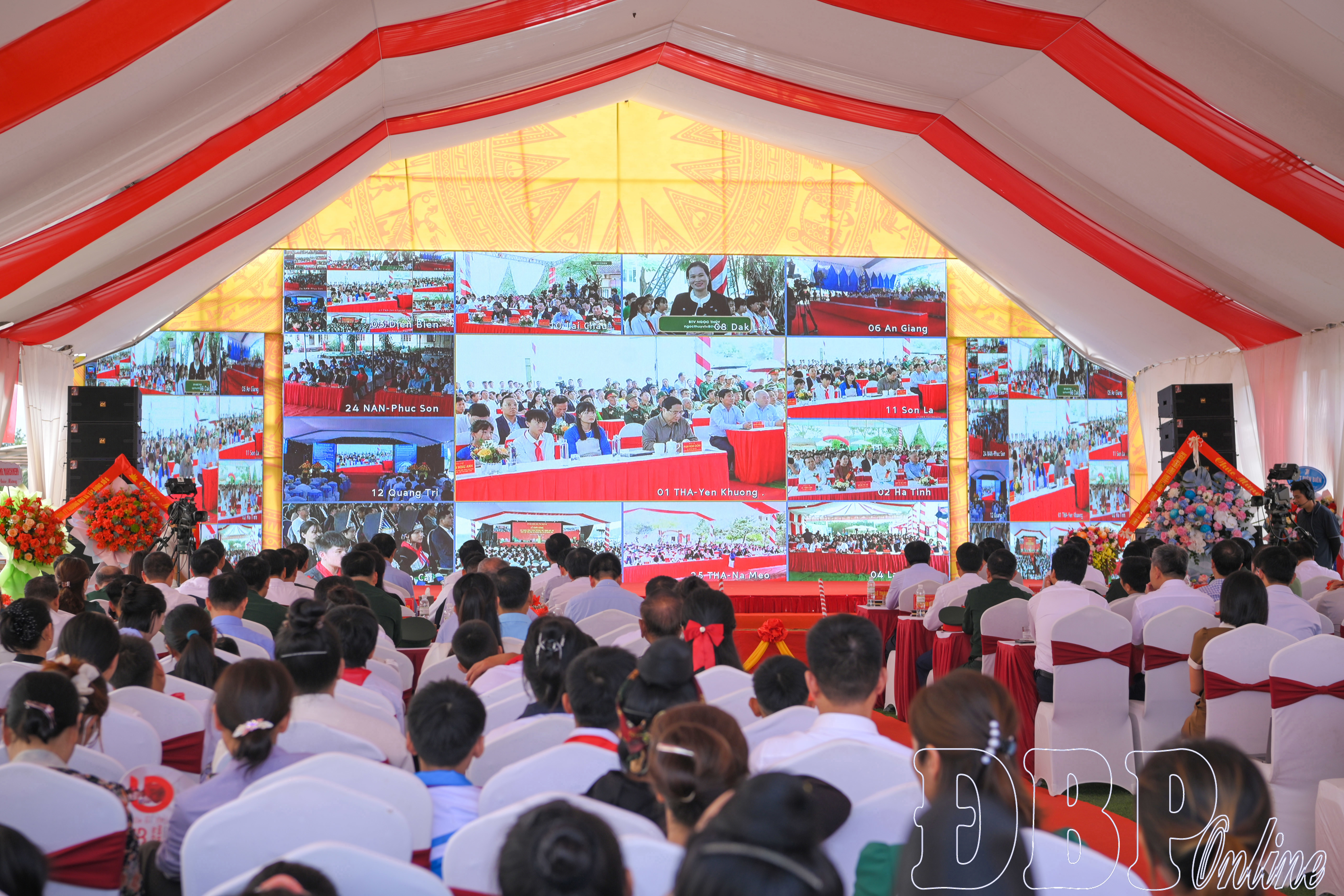 Đại biểu và học sinh, nhân dân xã Thanh Nưa theo dõi chương trình cầu truyền hình lễ khởi công xây dựng các trường phổ thông nội trú liên cấp tiểu học và trung học cơ sở tại các xã biên giới đất liền. Ảnh: Phạm Trung