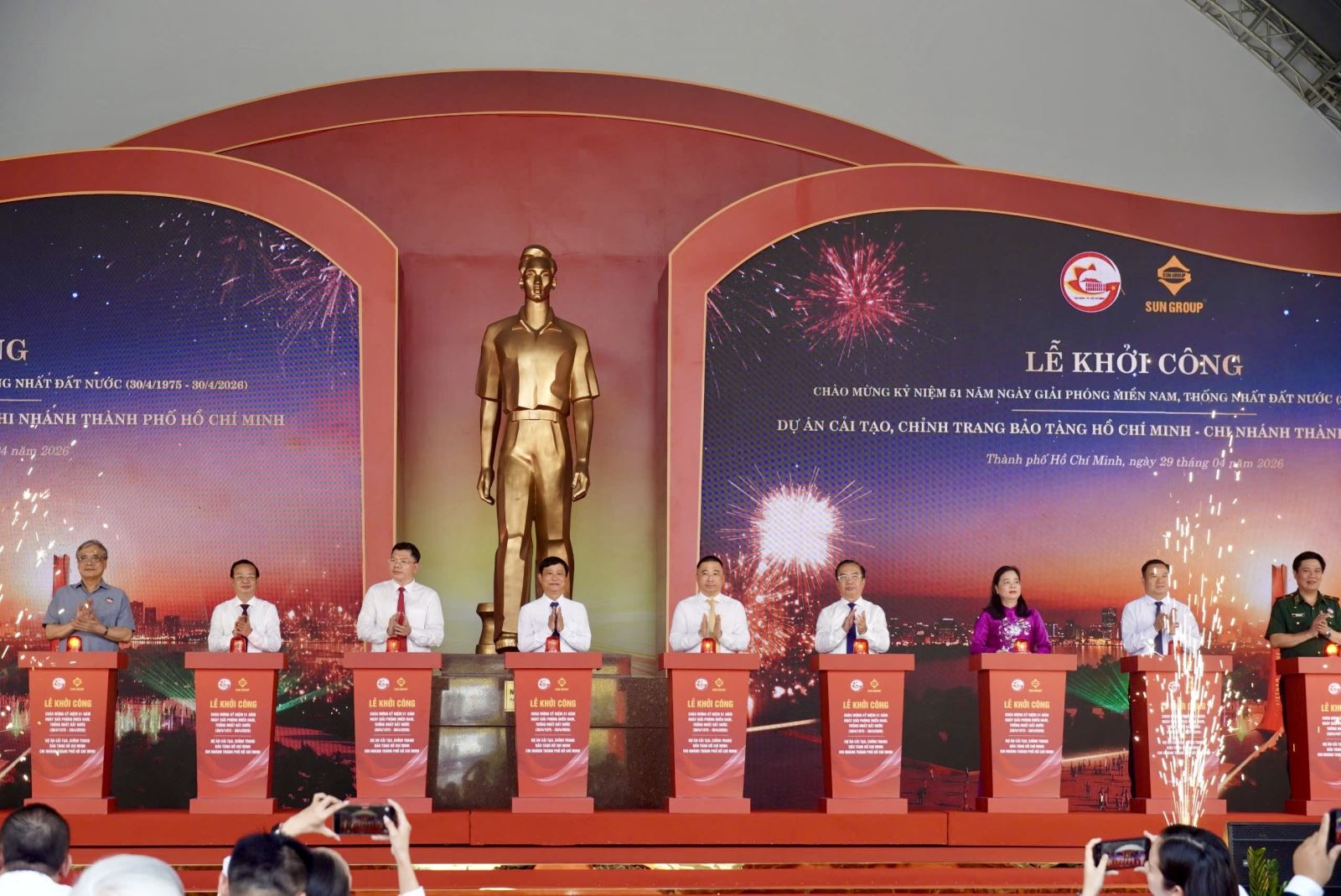 Đại diện lãnh đạo và khách mời thực hiện nghi thức khởi công Dự án cải tạo, chỉnh trang Bảo tàng Hồ Chí Minh - Chi nhánh TP Hồ Chí Minh.
