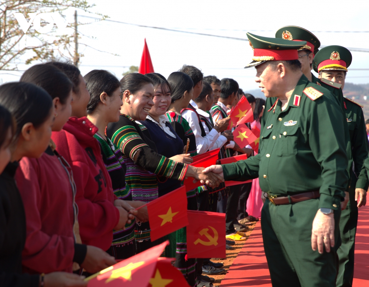 Đại tướng Nguyễn Trọng Nghĩa (mặc quân phục đứng giữa) trao quà tặng quân và dân ở xã biên giới Quảng Trực, tỉnh Lâm Đồng.