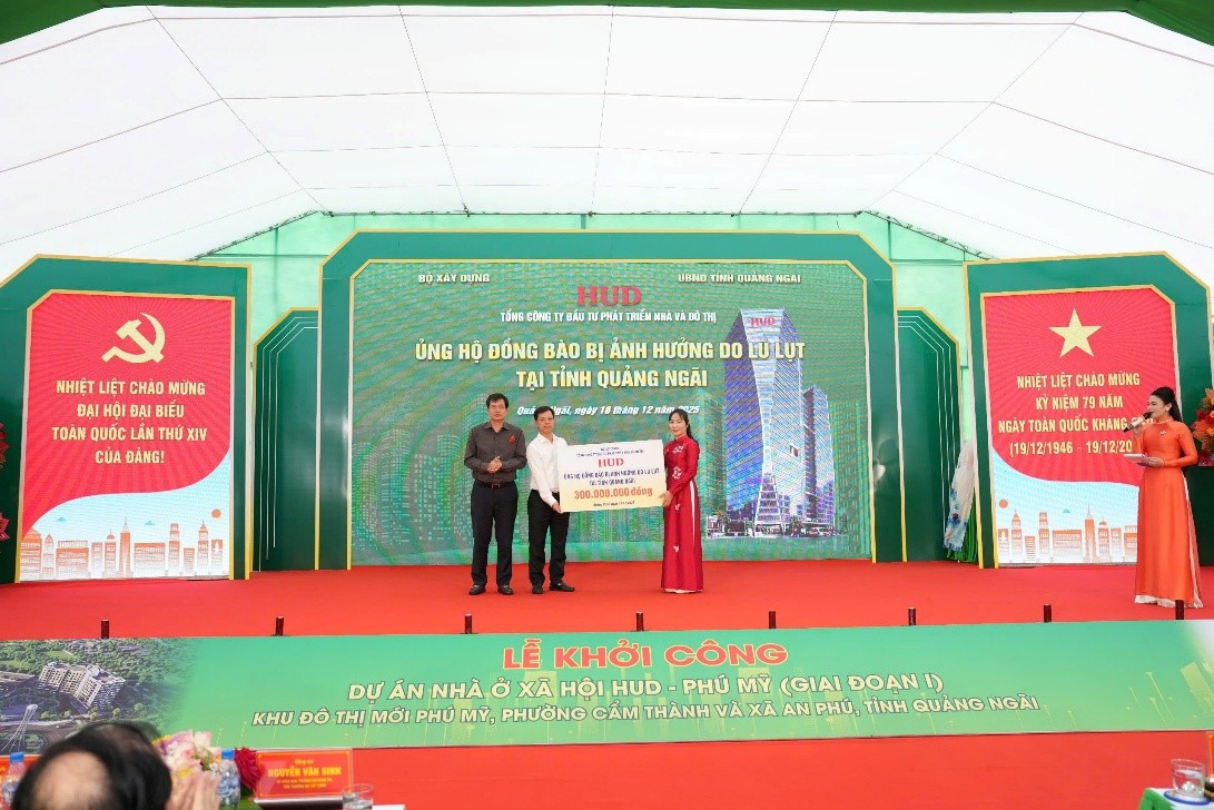 Tại Lễ khởi công, đại diện Tổng công ty HUD trao tặng tỉnh Quảng Ngãi 300 triệu đồng ủng hộ đồng bào bị ảnh hưởng lũ lụt.