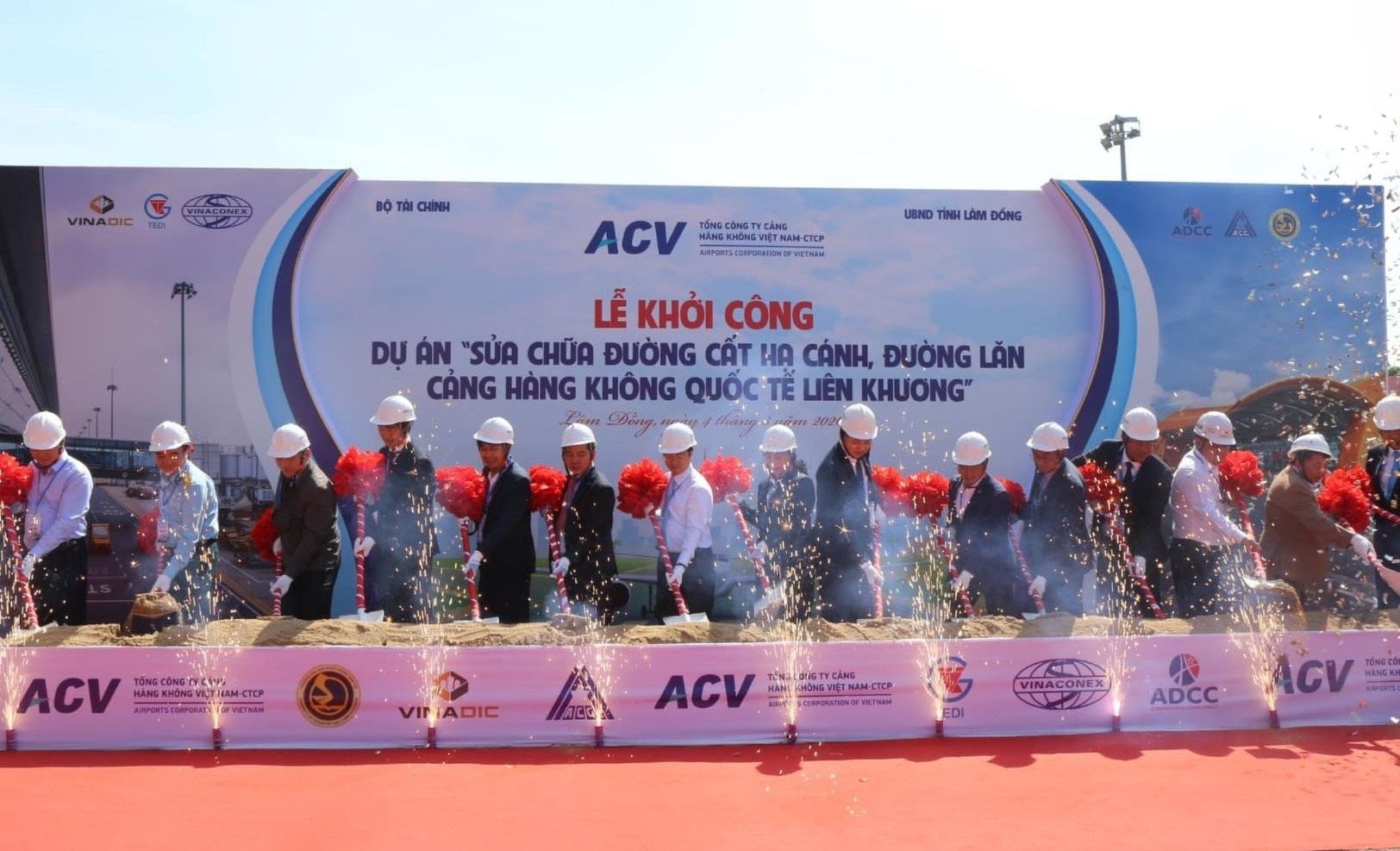 Các đại biểu thực hiện nghi thức khởi công dự án sửa chữa đường cất hạ cánh, đường lăn sân bay Liên Khương