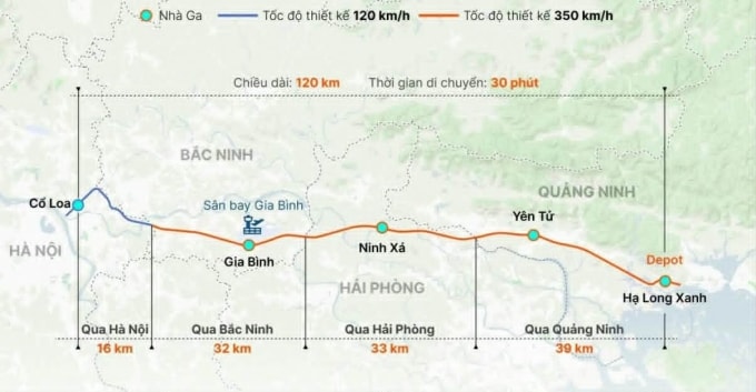 Về vận tốc, đoạn tuyến chính cho phép tàu chạy tối đa 350 km/h, riêng đoạn đi qua khu vực nội thành TP Hà Nội sẽ được giới hạn ở mức 120 km/h. Toàn tuyến bố trí 5 nhà ga hiện đại bao gồm: ga Cổ Loa, ga Gia Bình, ga Ninh Xá, ga Yên Tử và ga Hạ Long Xanh. Hệ thống bảo trì (depot) sẽ được xây dựng tập trung tại ga Hạ Long Xanh.