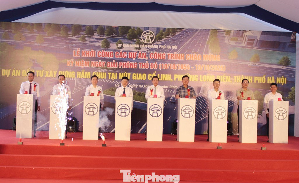 Lãnh đạo TP Hà Nội, chủ đầu tư và đại diện các sở ngành, nhà thầu khởi công dự án hầm chui Cổ Linh sáng 4/10. Ảnh: Trọng Đảng