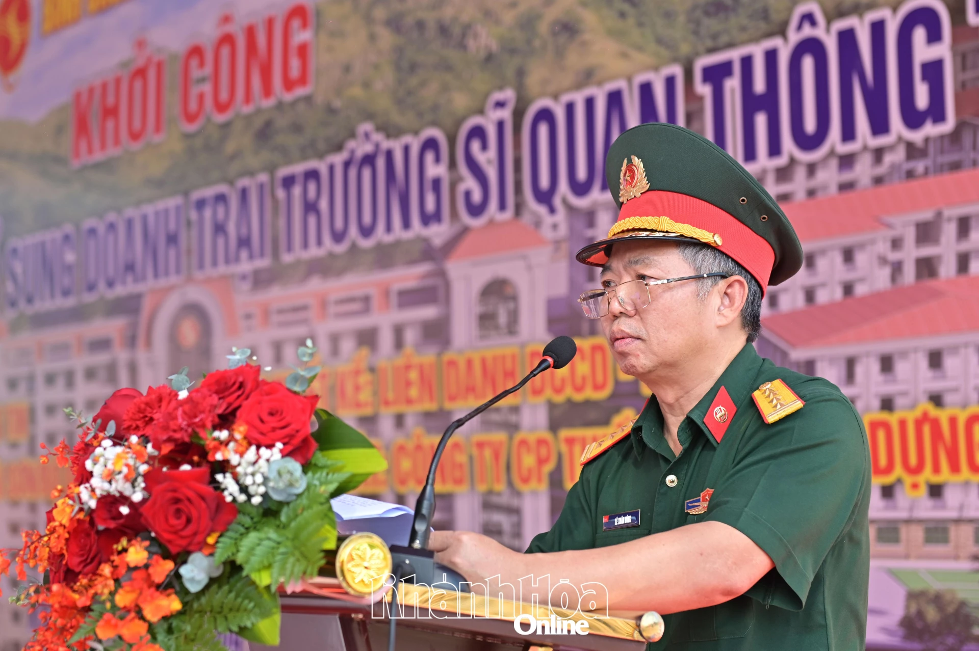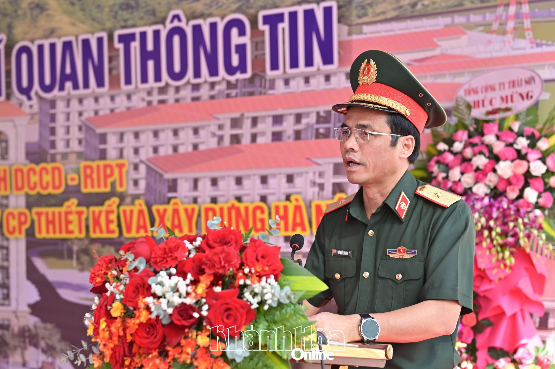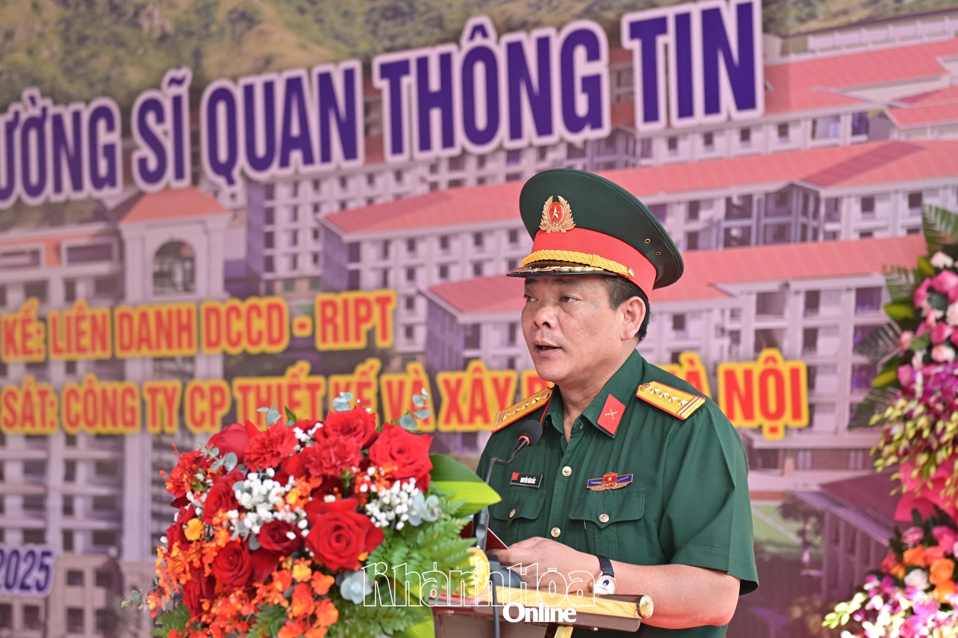 Đại tá Lê Xuân Hùng - Hiệu trưởng Trường Sĩ quan Thông tin phát biểu khởi công công trình.