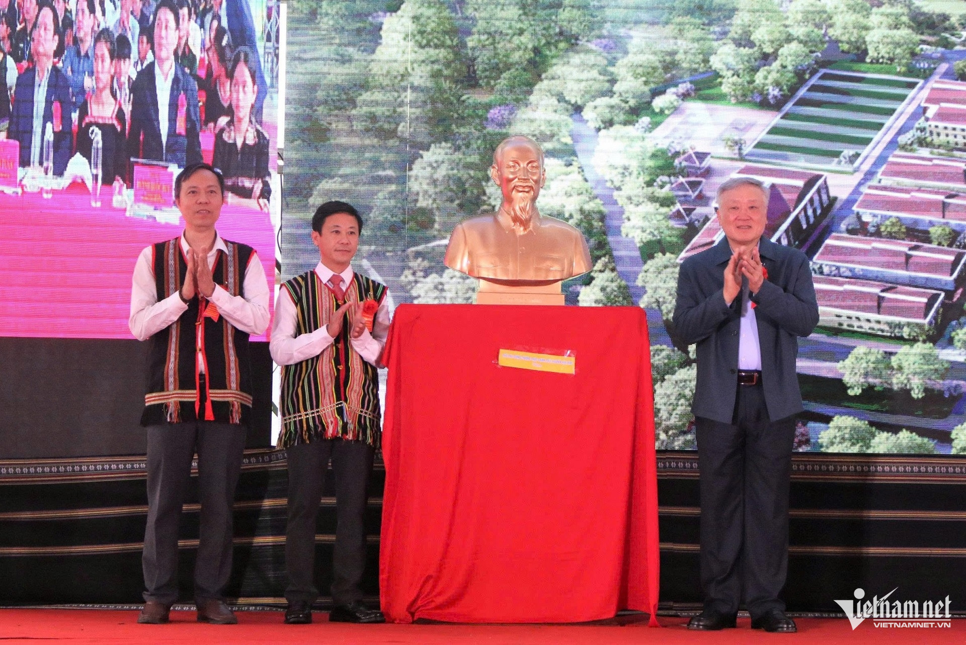 Phó Thủ tướng Thường trực Nguyễn Hòa Bình tặng tượng Bác Hồ cho Trường phổ thông nội trú liên cấp TH - THCS xã Dục Nông. Ảnh: N.C