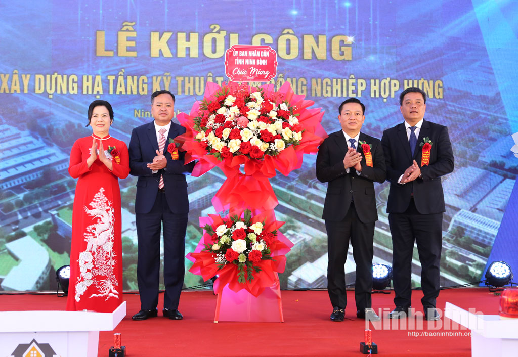 Đồng chí Nguyễn Cao Sơn, Tỉnh ủy viên, Phó Chủ tịch UBND tỉnh tặng hoa chúc mừng xã Hiển Khánh và chủ đầu tư xây dựng Cụm công nghiệp Hợp Hưng.