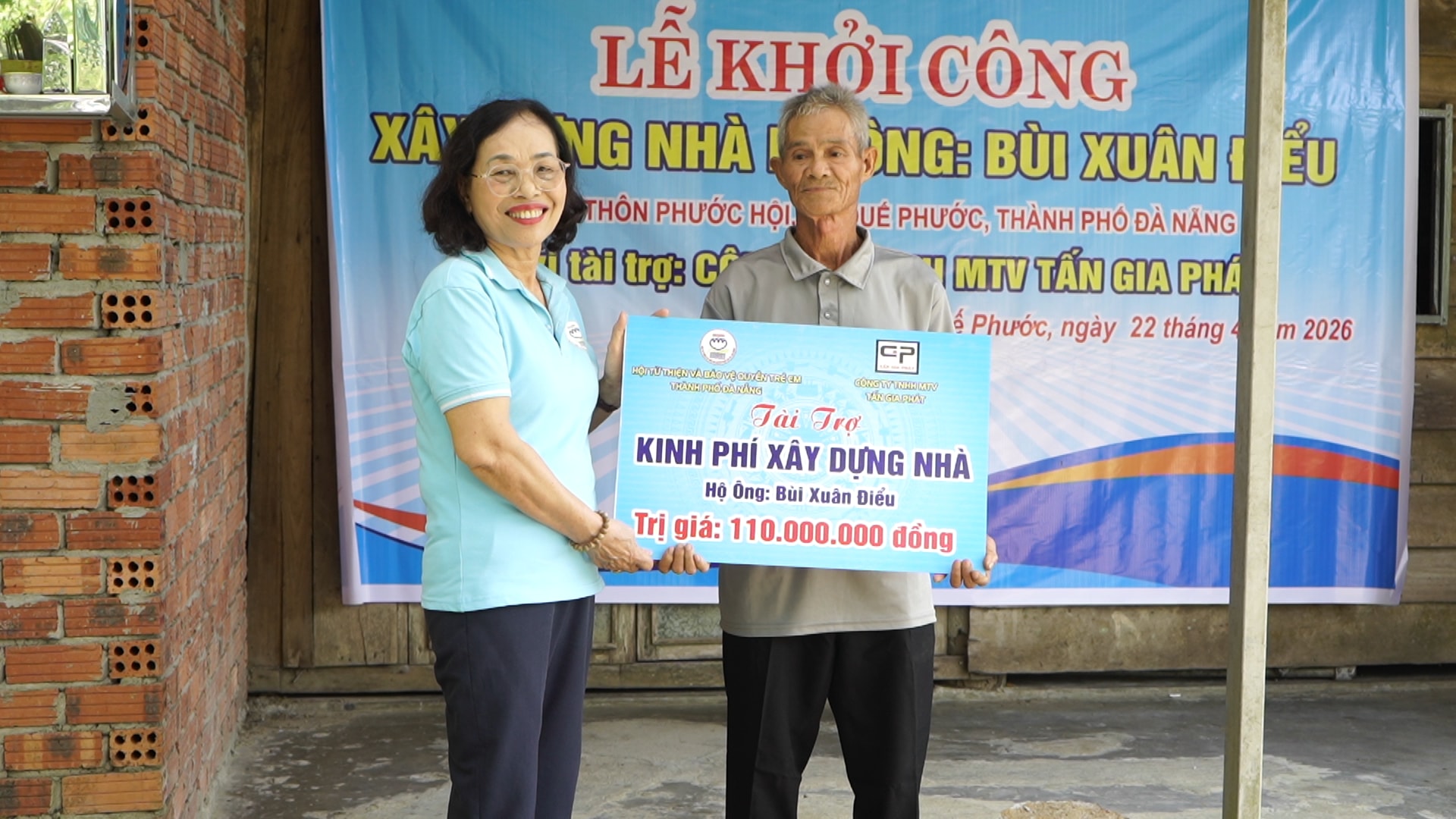 Chủ tịch Hội Từ thiện và Bảo vệ quyền trẻ em thành phố Lê Thị Tám trao biểu trưng hỗ trợ kinh phí xây dựng nhà cho gia đình ông Bùi Xuân Điểu. Ảnh: MINH THÔNG