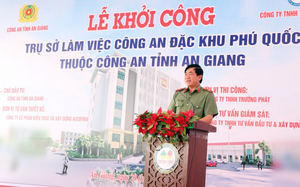 Phát biểu tại buổi lễ, Thiếu tướng Nguyễn Văn Hận, Giám đốc Công an tỉnh An Giang nhấn mạnh, việc khởi công xây dựng Trụ sở làm việc Công an đặc khu Phú Quốc không chỉ là bước đi cụ thể trong lộ trình hiện đại hóa lực lượng Công an cơ sở, mà còn tạo nền tảng vững chắc để nâng cao chất lượng công tác nắm tình hình, chủ động phòng ngừa, đấu tranh có hiệu quả với các loại tội phạm và vi phạm pháp luật.