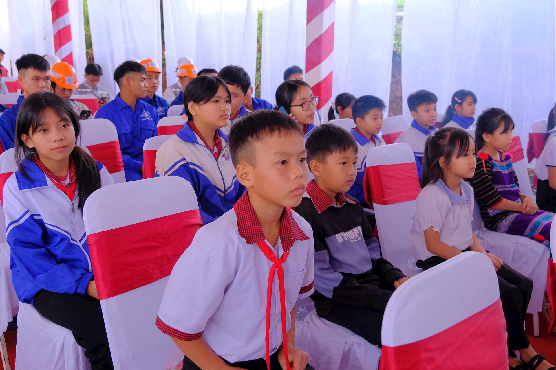 Các em học sinh xã Quảng Trực theo dõi chương trình Lễ khởi công
