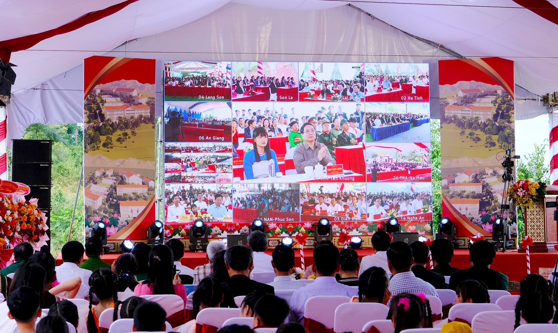 Các đại biểu tại xã Quảng Trực theo dõi trực tiếp Lễ khởi công xây dựng Trường phổ thông nội trú liên cấp TH và THCS trên toàn quốc