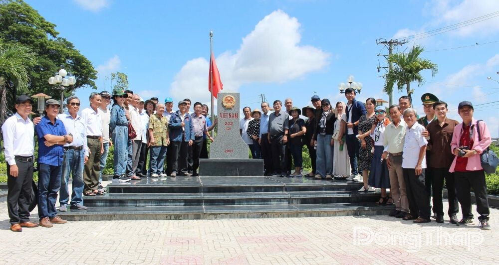 Các nhà báo và văn nghệ sĩ tỉnh Đồng Tháp tại cột mốc biên giới cửa khẩu Dinh Bà.