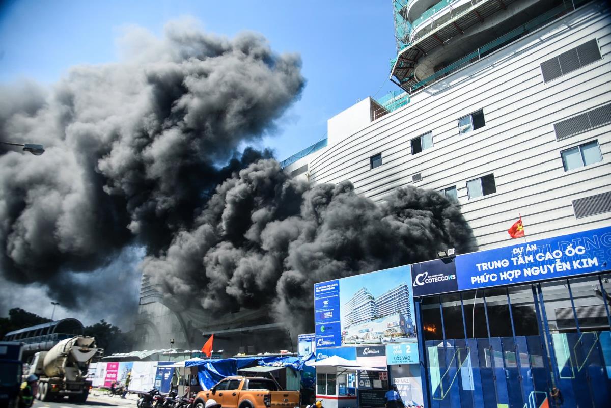 Khói đen đặc quánh bốc cao, lan rộng ra khu vực xung quanh. Các mũi chữa cháy được chia thành nhiều hướng, sử dụng mặt nạ phòng độc và lăng phun cao áp tiếp cận khu vực cháy bên trong; đồng thời, nhiều vòi nước từ xe chữa cháy phun liên tục vào các tầng trên để ngăn cháy lan.