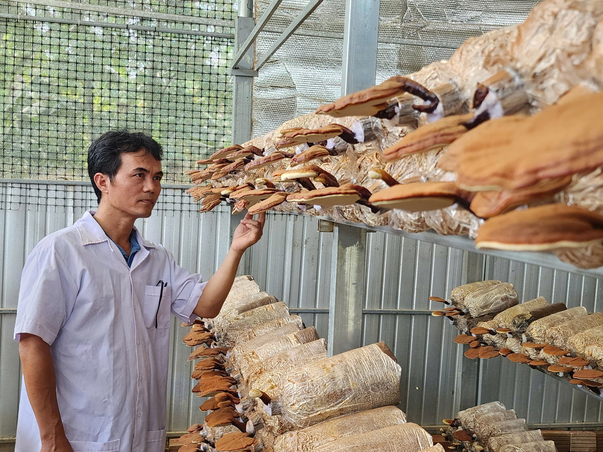 Đối với nấm linh chi, việc nuôi trồng phụ thuộc nhiều vào điều kiện thời tiết, thường triển khai từ tháng 8 đến tháng 12 âm lịch. Sau một tháng nuôi cấy, nấm được chuyển sang trại trồng để tiếp tục phát triển. Khi đạt chất lượng, nấm được thu hoạch, sấy khô và đóng gói, với giá bán khoảng 1,5 triệu đồng/1kg.