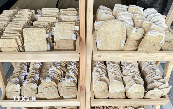 Các vật dụng bông tắm, miếng rửa mặt, miếng rửa chén làm từ sợi xơ mướp mềm. (Ảnh: Hồng Nhung/TTXVN)
