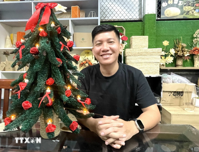 Anh Đỗ Đăng Khoa, chủ dự án “Làng mướp” cùng với cây thông Noel trang trí bằng xơ mướp. (Ảnh: Hồng Nhung/TTXVN)