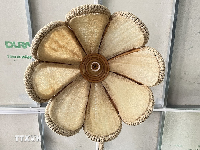 Chụp đèn trang trí nội thất được làm từ xơ mướp và lá bắp thân thiện môi trường. (Ảnh: Hồng Nhung/TTXVN)