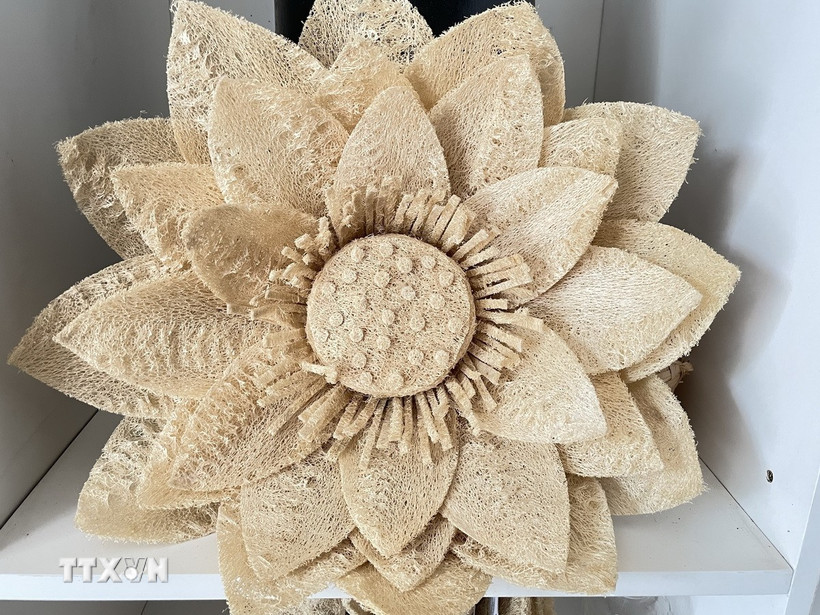 Xơ mướp được Đỗ Đăng Khoa “biến hình” thành những bông hoa thiên nhiên tuyệt đẹp. (Ảnh: Hồng Nhung/TTXVN)