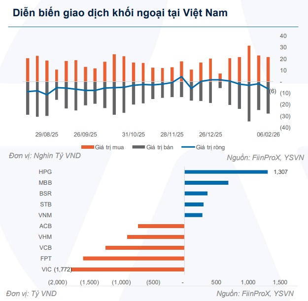 Trên Thị trường Chứng khoán Việt Nam, khối ngoại ghi nhận tuần bán ròng thứ 4 liên tiếp với giá trị –6,132 tỷ đồng. Áp lực bán ròng tập trung tại VIC (-1,772 tỷ), FPT (-1,590 tỷ) và VCB (-1,236 tỷ). Trong khi mua ròng nổi bật tại HPG (+1,307 tỷ), MBB (+689 tỷ) và BSR (+363 tỷ).