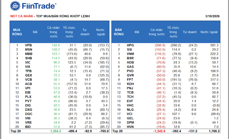 Tính riêng giao dịch khớp lệnh, họ mua ròng 5/18 ngành, chủ yếu là ngành Ngân hàng. Top mua ròng của nhà đầu tư cá nhân tập trung gồm: VPB, MSN, MBB, SHB, VIC, VIX, TPB, GEX, VCB, ACB.