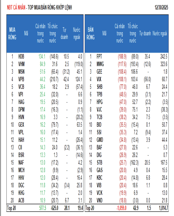Tính riêng giao dịch khớp lệnh, họ mua ròng 6/18 ngành, chủ yếu là ngành Bất động sản. Top mua ròng của nhà đầu tư cá nhân tập trung gồm: HDB, VHM, MSN, VPB, VCB, VPI, HAG, DPM, HVN, GEX.