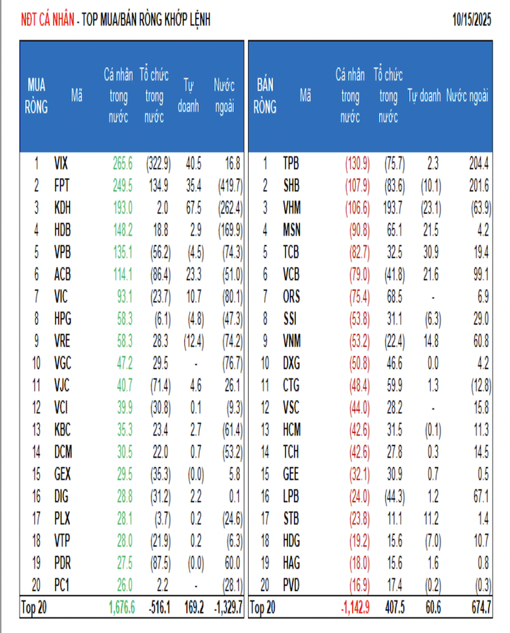 Nhà đầu tư cá nhân mua ròng 615.1 tỷ đồng, trong đó họ mua ròng khớp lệnh là 639.0 tỷ đồng.