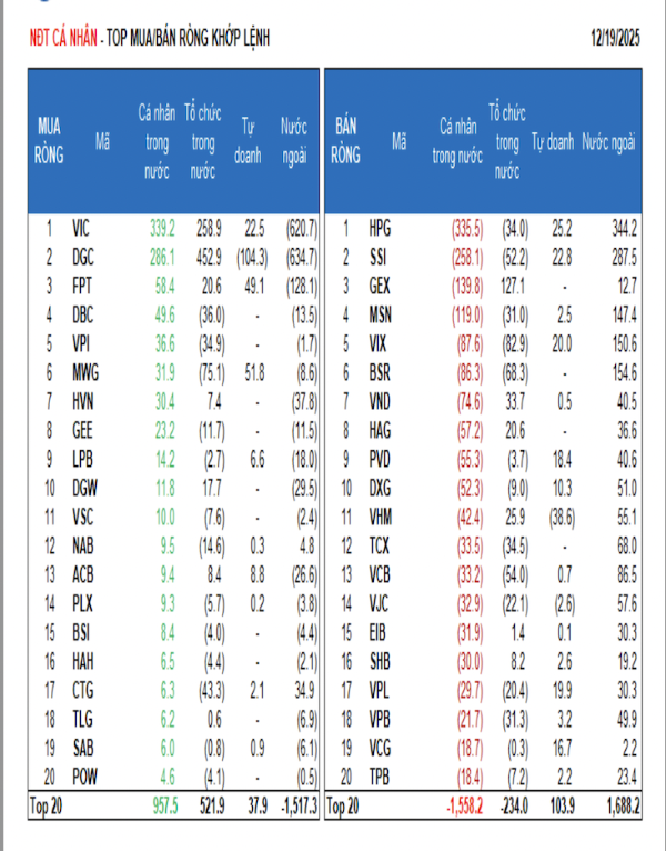 Tính riêng giao dịch khớp lệnh, họ mua ròng 6/18 ngành, chủ yếu là ngành Hóa chất. Top mua ròng của nhà đầu tư cá nhân tập trung gồm: VIC, DGC, FPT, DBC, VPI, MWG, HVN, GEE, LPB, DGW.