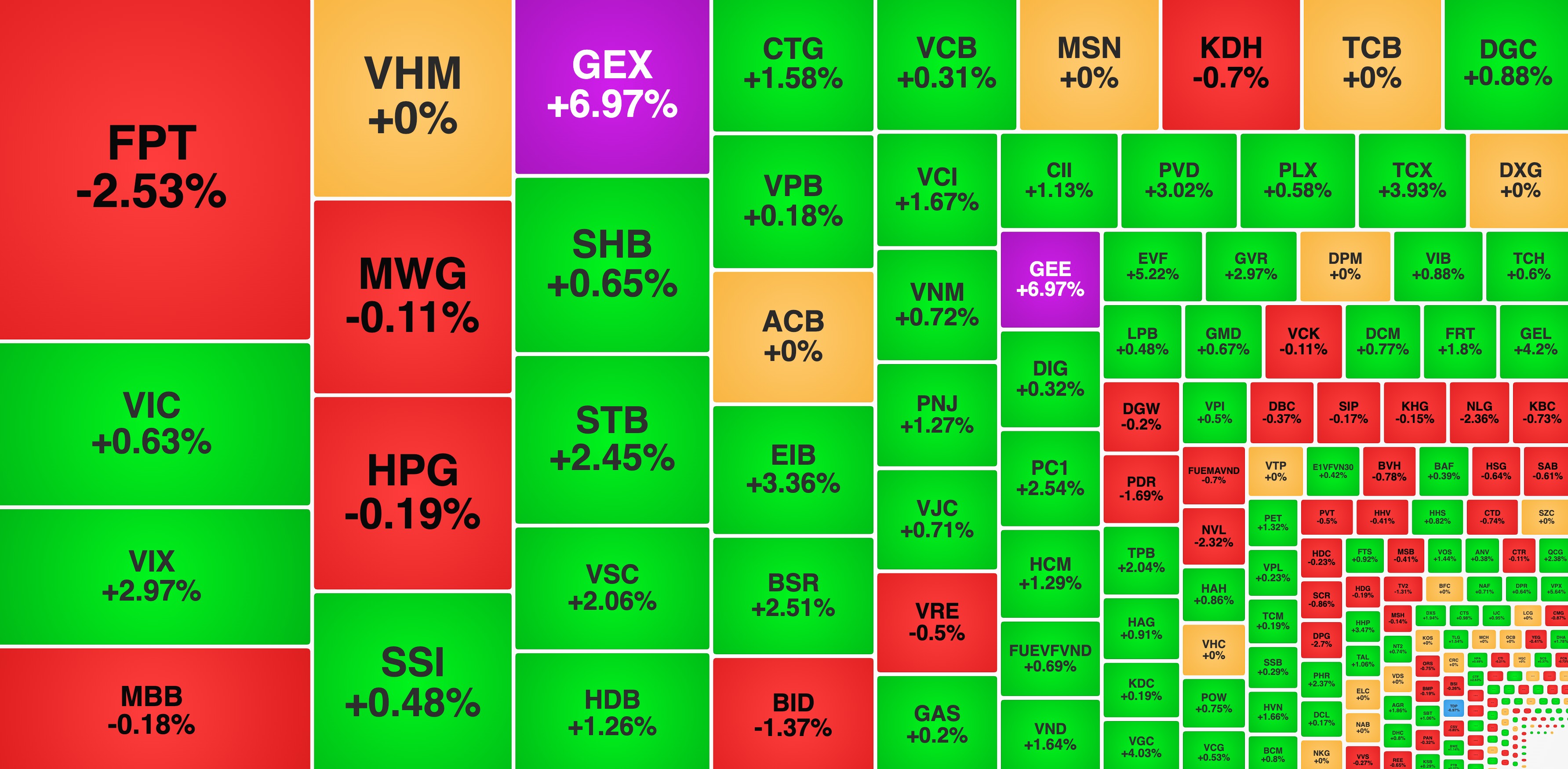 Nhóm cổ phiếu Gelex hút mạnh dòng tiền mua mới, với GEX và GEE cùng tăng trần, VGC và “tân binh” GEL cùng tăng hơn 4%.