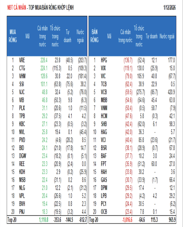 Nhà đầu tư cá nhân bán ròng 20.5 tỷ đồng, trong đó họ mua ròng khớp lệnh là 26.4 tỷ đồng.