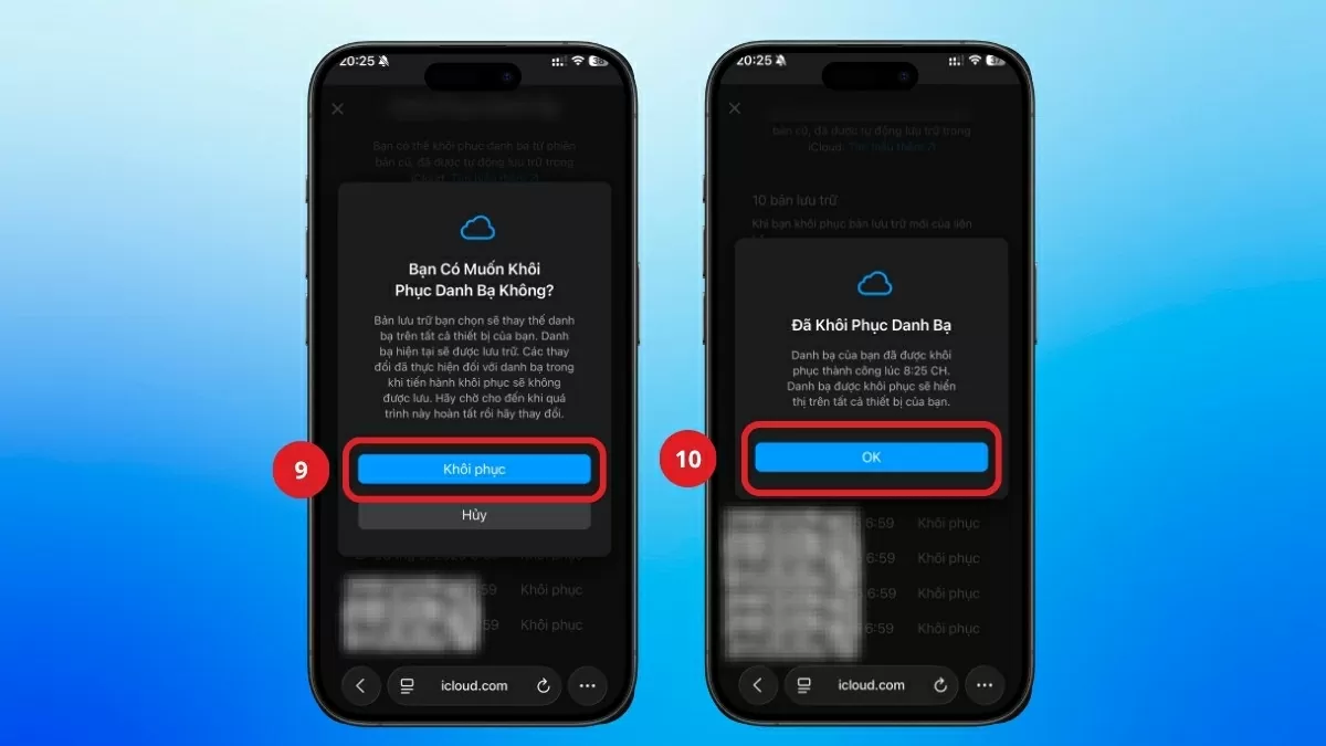 Nhấn Restore (Khôi phục) tại phiên bản bạn muốn lấy lại. Chờ vài phút để quá trình hoàn tất, rồi chọn OK để xác nhận. Danh bạ của bạn sẽ được khôi phục trên tất cả thiết bị đang bật đồng bộ iCloud.