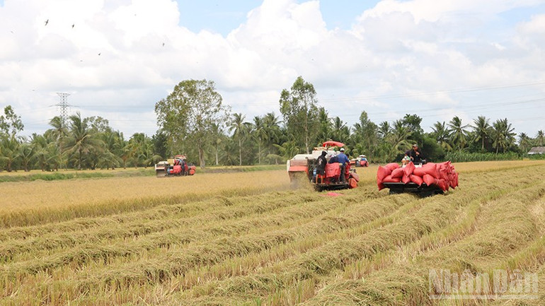 Nông dân xã Tam Ngãi, tỉnh Vĩnh Long thu hoạch lúa cao sản.