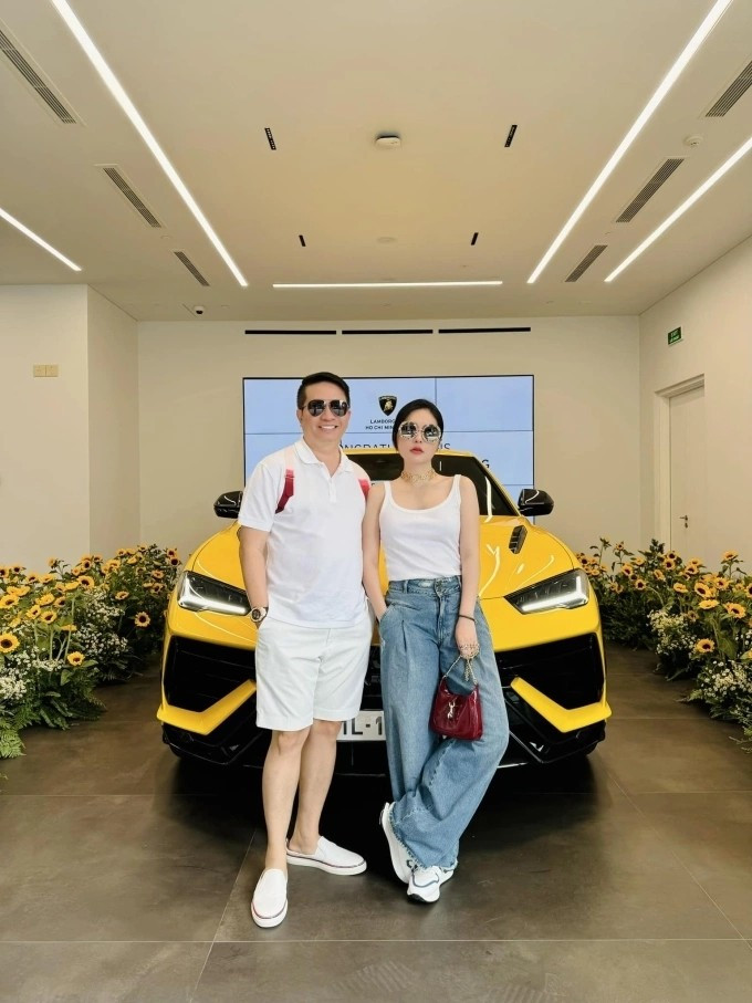 Tháng 3/2024, Đoàn Di Băng cùng chồng nhận Lamborghini Urus Performante màu vàng giá khởi điểm 16,3 tỷ đồng tại một showroom ở TP HCM. Ảnh: FBNV