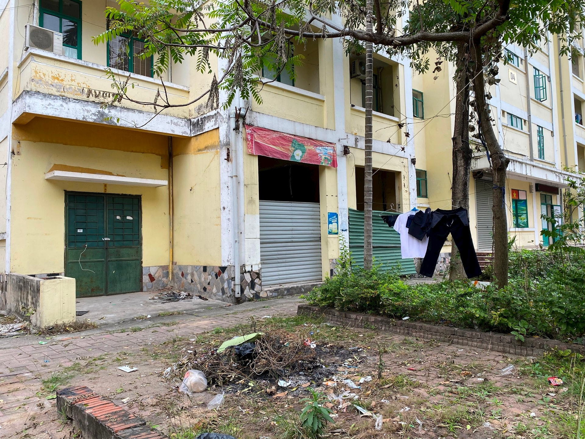 Ghi nhận thực tế cho thấy, nhiều hạng mục tại khu nhà đã xuống cấp nghiêm trọng. Hàng loạt ki-ốt cửa đóng then cài, che chắn tạm bợ, bong tróc, han gỉ. Vỉa hè quanh các tòa nhà cỏ dại mọc um tùm, rác thải sinh hoạt vứt bừa bãi.