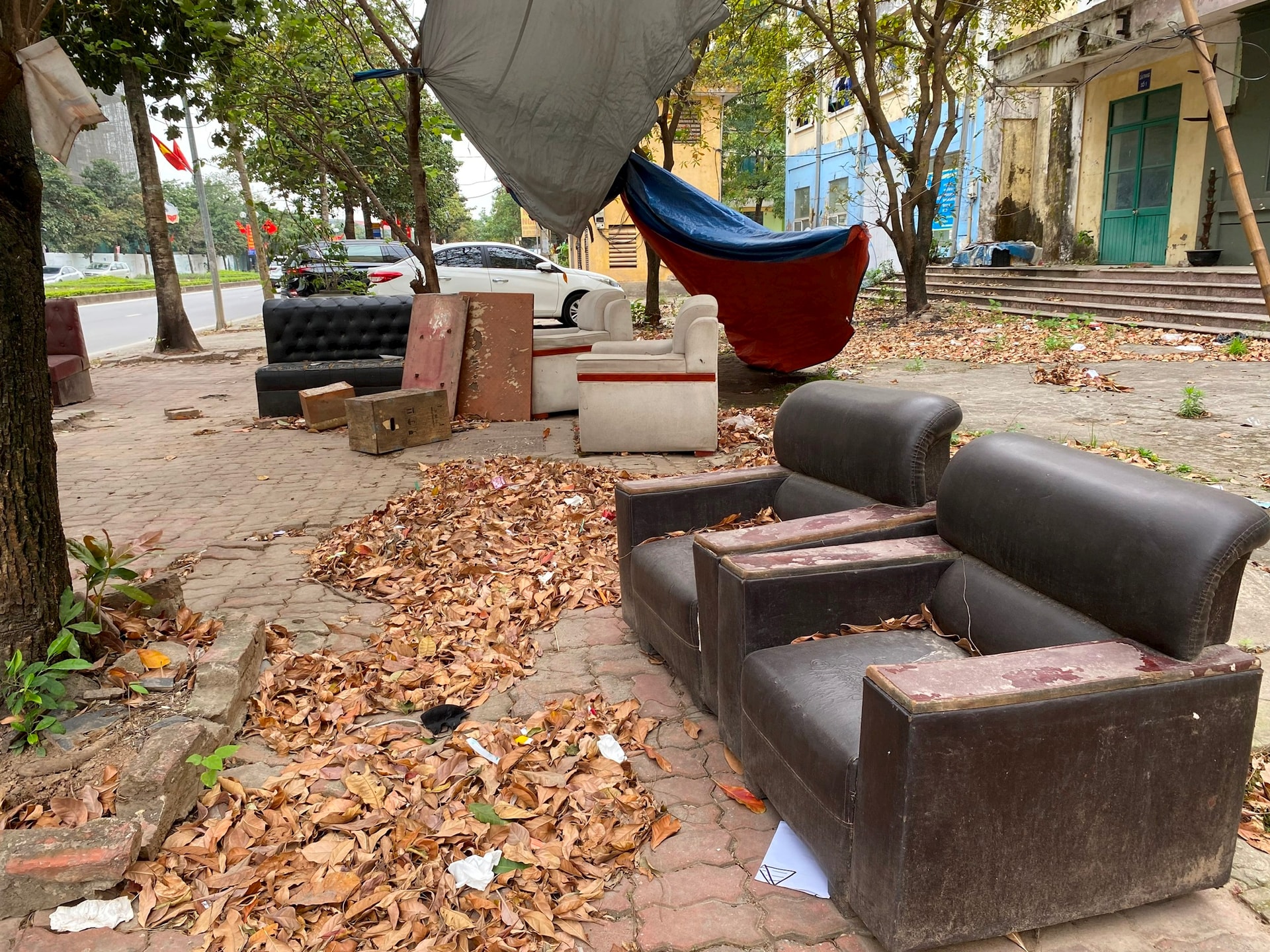 Dọc tuyến đường nội bộ khu nhà ở, hình ảnh càng trở nên nhếch nhác khi bàn ghế cũ, sofa hỏng bị vứt ngổn ngang trên vỉa hè như “phòng khách lộ thiên”. Nhiều xe hàng nước phủ bạt kín, chiếm dụng toàn bộ mặt tiền tầng 1. Rác thải, lá khô không được thu gom, tích tụ thành từng đống. Nhìn tổng thể, khu vực này không khác gì một khu bị bỏ hoang.