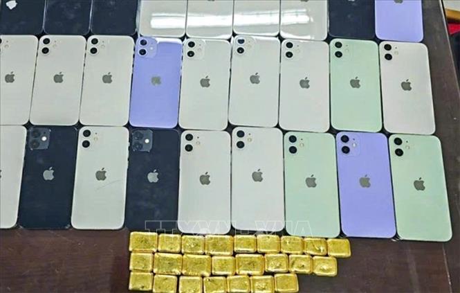 Tang vật thu giữ gồm 24 thỏi kim loại màu vàng và 32 điện thoại iPhone. Ảnh: TTXVN phát