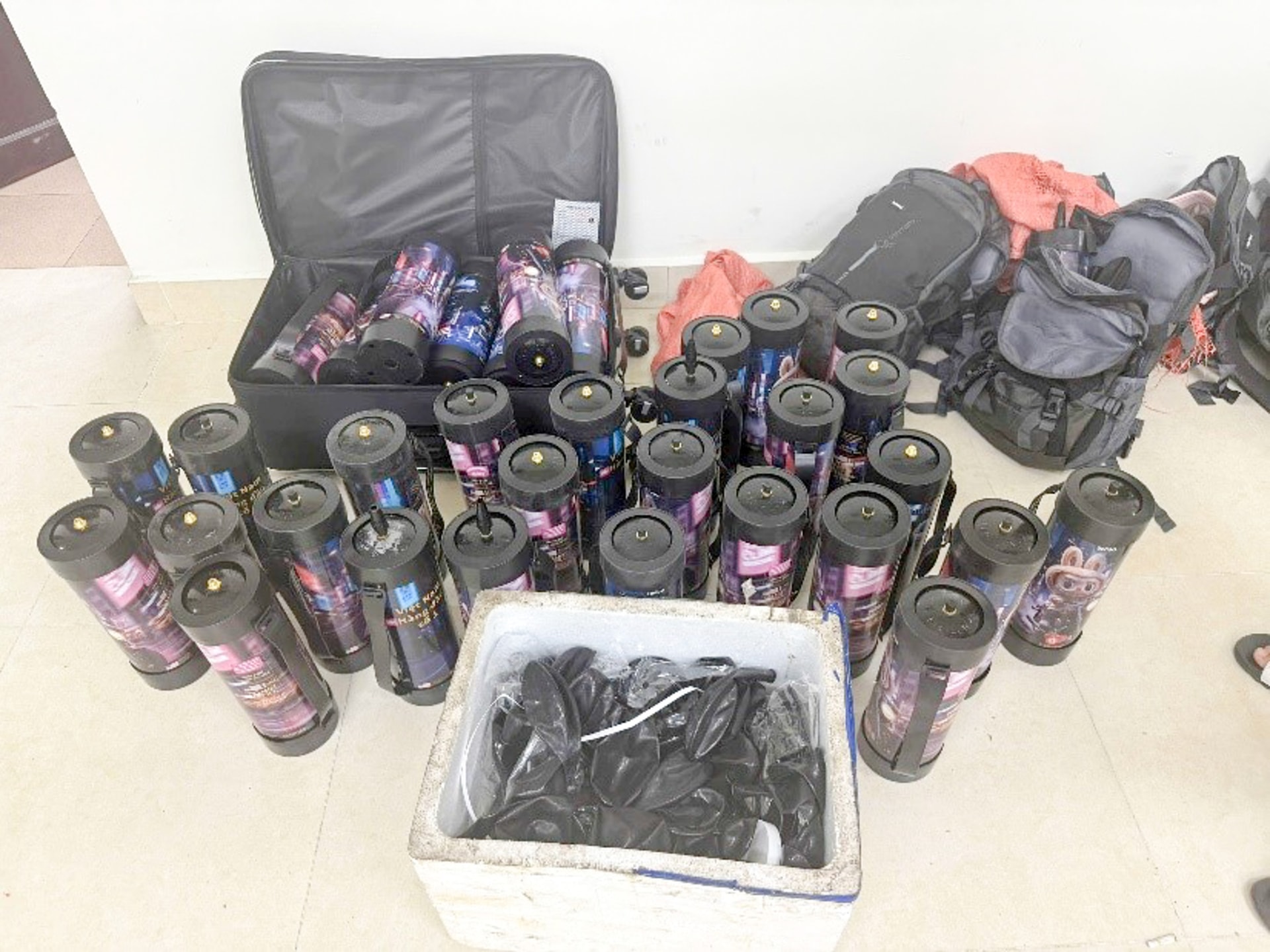Tại thời điểm kiểm tra, cơ sở có 73 nhân viên và 58 khách, trong đó có 36 khách đang sử dụng bóng cười. Cơ quan Công an đã thu giữ 28 bình khí cười (N2O), 12 vỏ bình, cùng nhiều vỏ bóng đã qua sử dụng.