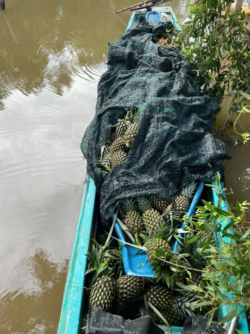 Tang vật bị cơ quan công an thu giữ gồm 357 kg trái khóm, 1 xuồng nhựa composite đã qua sử dụng và nhiều vật dụng như dao, lưỡi liềm, 2 vỏ lãi và 2 máy xăng.