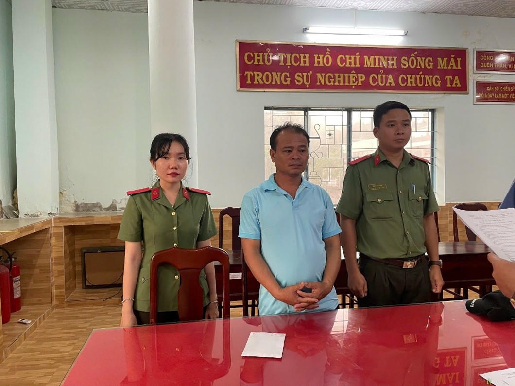 Điều tra viên tống đạt các Quyết định khởi tố vụ án, khởi tố bị can, thực hiện lệnh bắt bị can để tạm giam đối với Trần Văn Tiếng. Ảnh: Hoàng Đô.