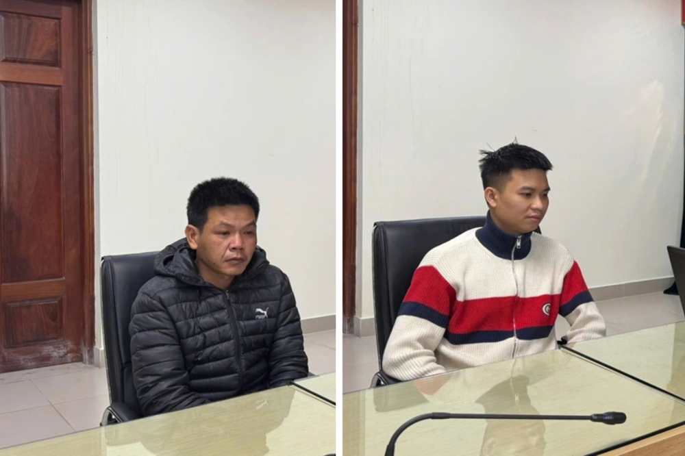 Đối tượng Nguyễn Ngọc Quang (trái) và Lê Văn Tuấn (phải) tại cơ quan công an. Ảnh: Công an tỉnh Thái Nguyên