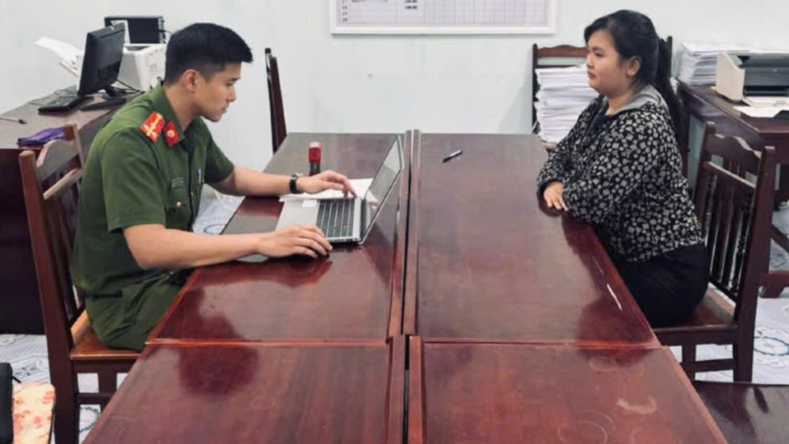 Cán bộ điều tra làm việc với Cáp Thị Thoan. Ảnh: CA