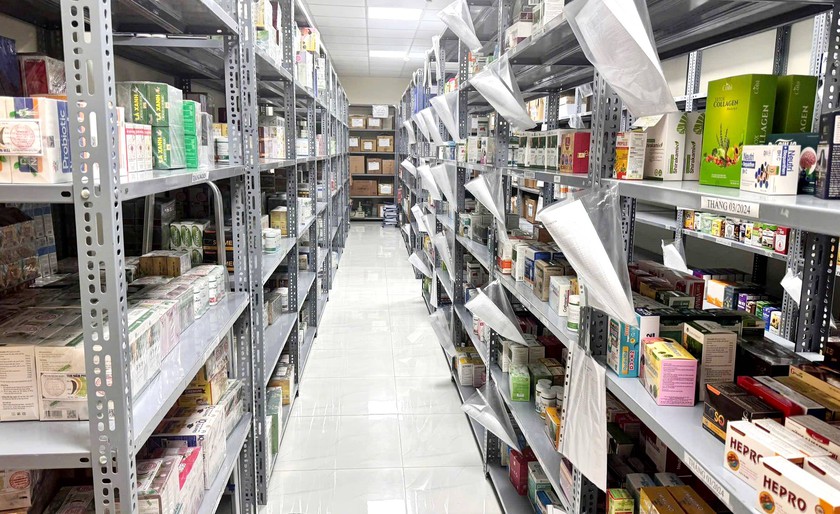 Thực phẩm chức năng và thuốc giả xếp trong kho của Công TNHH Medistar Việt Nam. Ảnh: Tống Huệ