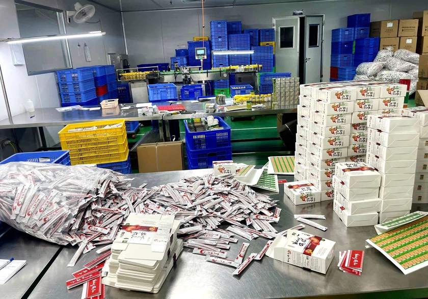 Quá trình điều tra bước đầu xác định: Từ năm 2012 đến năm 2025, các đối tượng trong đường dây đã bán ra thị trường hàng trăm tấn thực phẩm chức năng giả các loại, với doanh thu gần 1.800 tỷ đồng, gây ảnh hưởng nghiêm trọng đến sức khỏe và quyền lợi của người tiêu dùng. Ảnh: Tống Huệ