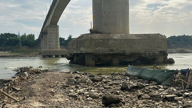 Cụ thể, mực nước sông xuống thấp làm lộ rõ hàng loạt móng cọc các trụ cầu, trong đó trụ T3 với phần đất nền bị xói mòn tạo ra một hốc lớn cao khoảng 2m; một số móng cọc lộ ra cốt thép rỉ sét, mất hoàn toàn lớp bê tông bảo vệ trụ cầu.