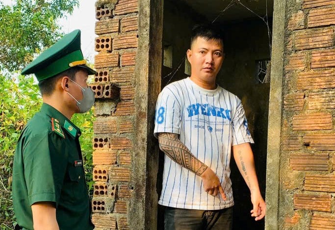 Lực lượng Đồn Biên phòng Tam Thanh kiểm tra, làm việc với đối tượng Nguyễn Văn Hùng. Ảnh: NHẬT NAM
