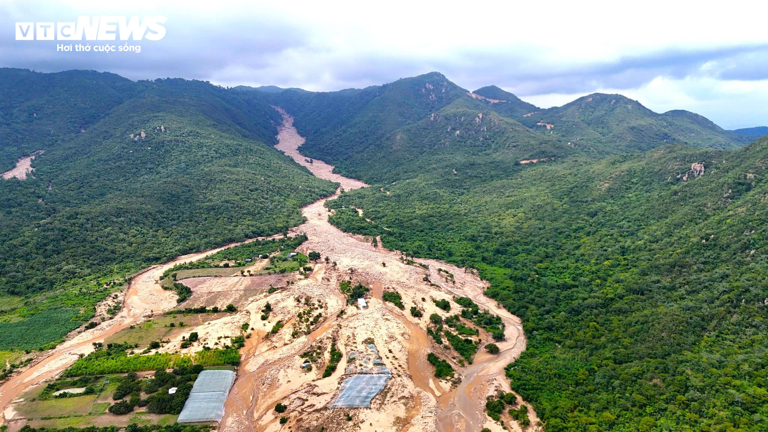 Vỡ hồ chứa nước ở xã Tuy Phong khiến đất đá từ trên núi tràn xuống khu vực vườn tược, dân cư bên dưới. Ảnh: THIÊN TRANG
