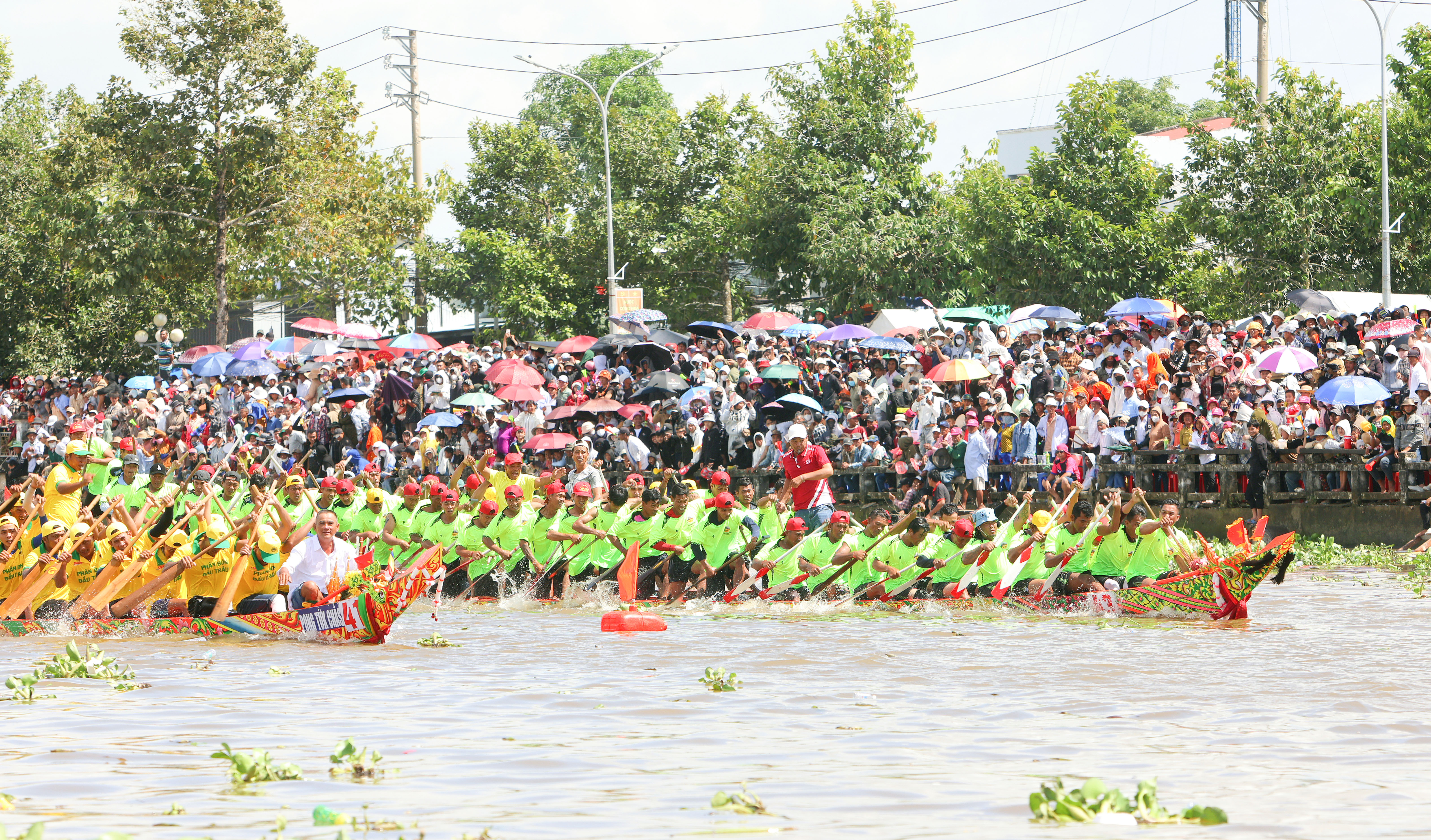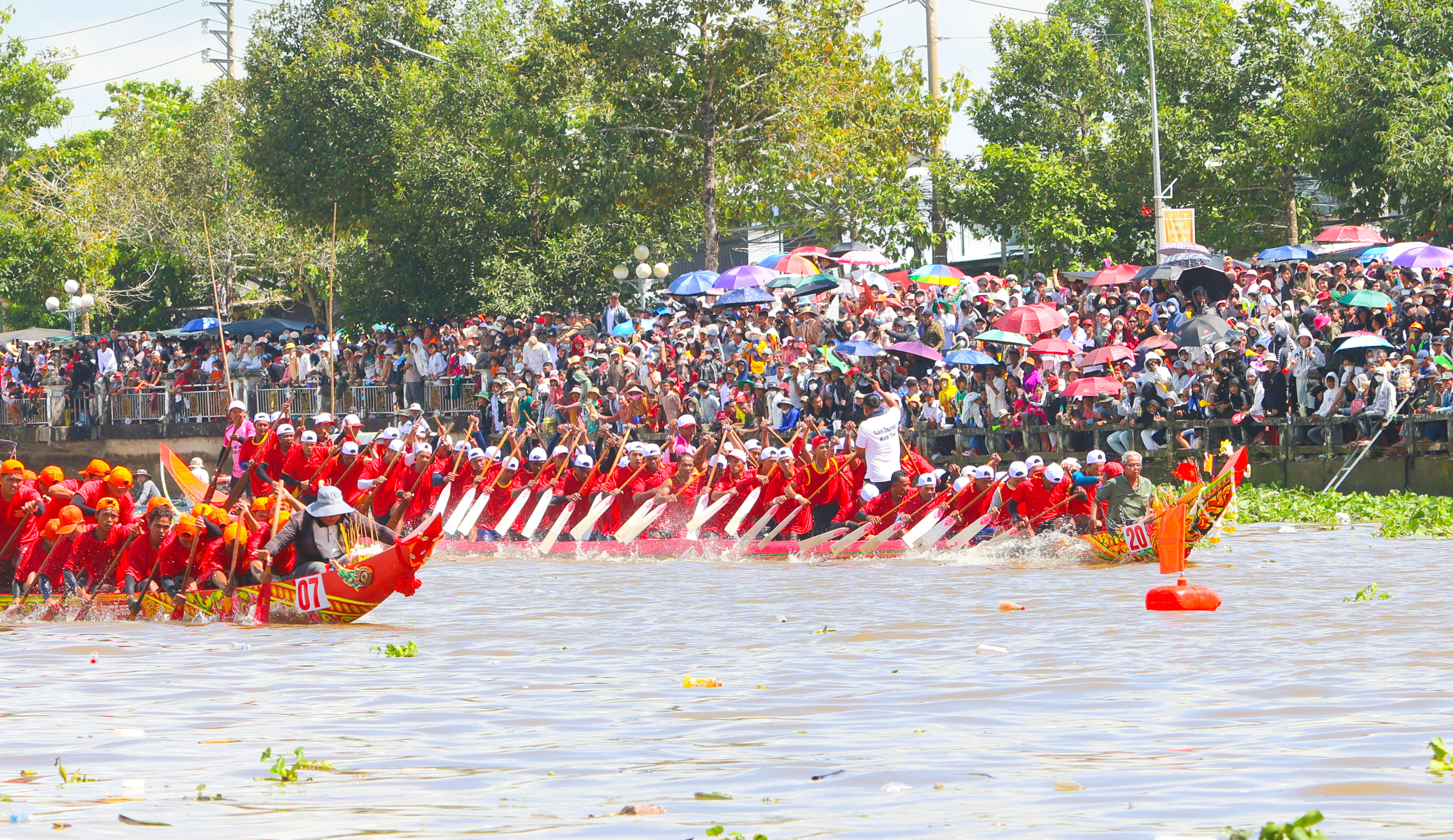 Theo từng nhịp dầm bơi của vận động viên là tiếng reo hò cổ vũ của hàng ngàn khán giả ở bờ sông