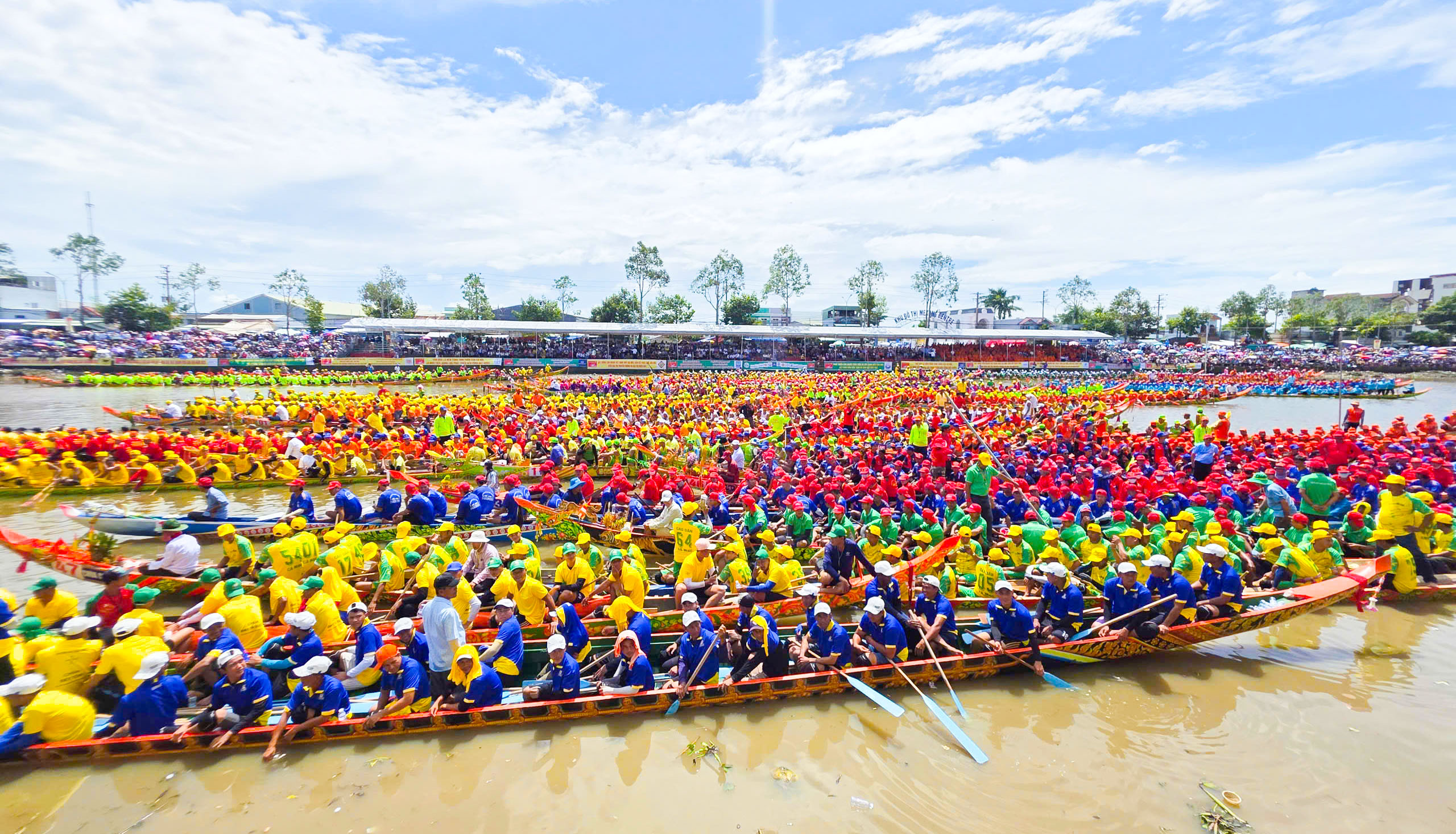 Hàng ngàn vận động viên quy tụ về khán đài đua ghe Ngo trên sông Maspéro để dự lễ khai mạc
