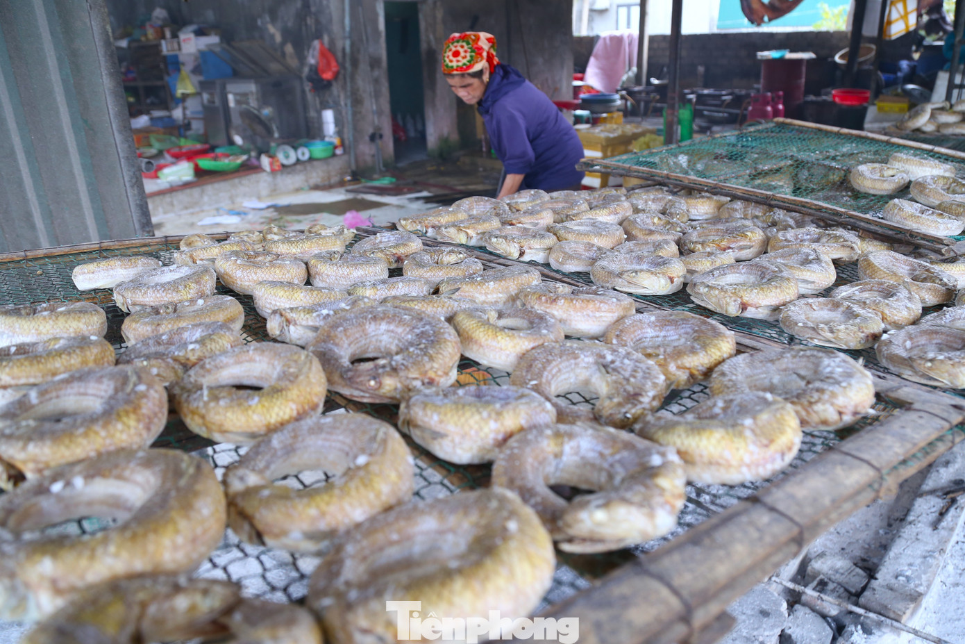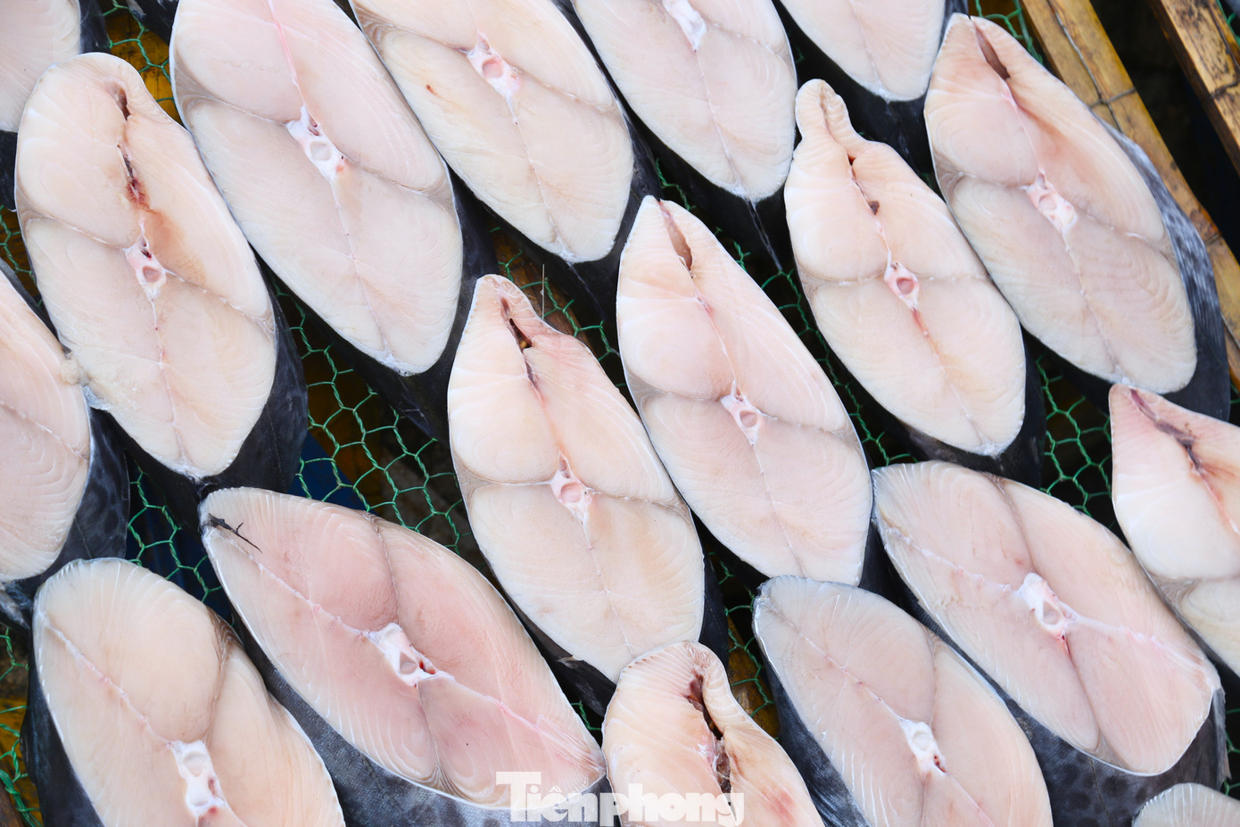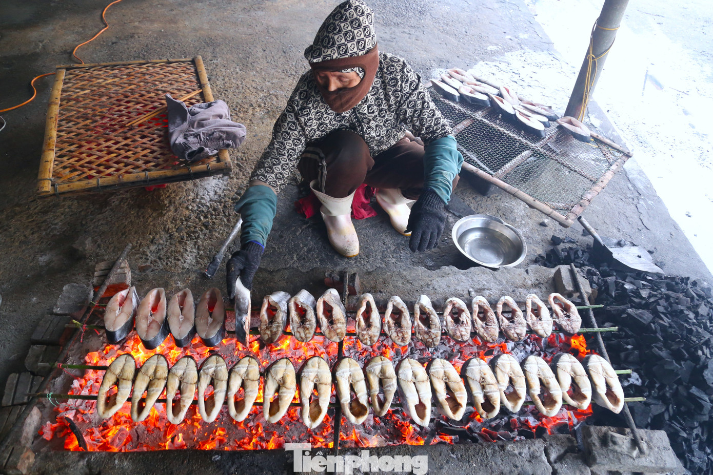 Trong các loại hải sản, cá thu có giá trị kinh tế cao nhất, trở thành đặc sản chủ lực mỗi dịp Tết. Cá mua về được cắt khúc, phân loại, đặt lên giàn thép phơi 3-5 tiếng cho ráo nước trước khi nướng.