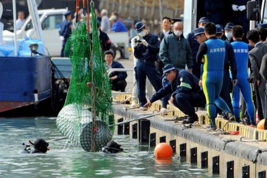 Cảnh sát trục vớt chiếc thùng phuy chứa thi thể của ông Hashimoto. (Nguồn: Asahi Shimbun)