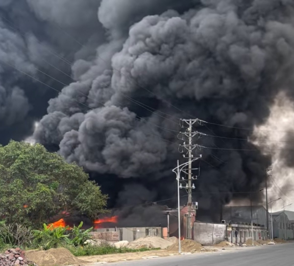 Cột khói đen sì bao trùm khu nhà xưởng và bốc cao.